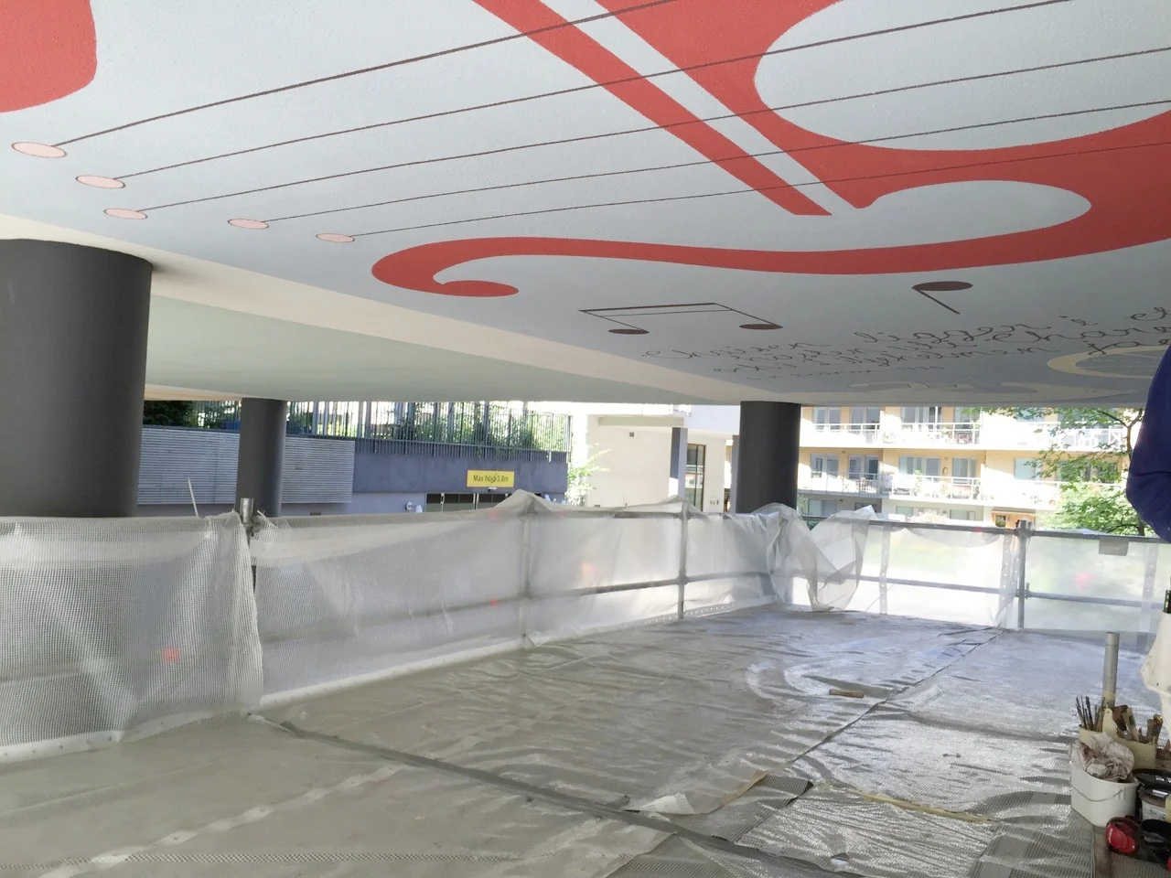 Vid Liljeholmstorget i Stockholm skapade och målade jag tillsammans med min kollega Sara Kebbon från Karla Design & Dekorationsmåleri upp dessa två takmålningar åt en bostadsrättsförening. Våra inspirationskällor till detta projekt var den närliggande sjön Trekanten, Liljeholmens Stearinfabrik som startade sin produktion i detta område samt Carl Michael Bellman. Under arbetets gång gjordes ett reportage av Tidningen Liljeholmen/Älvsjö där ni kan läsa mer om denna målning.
