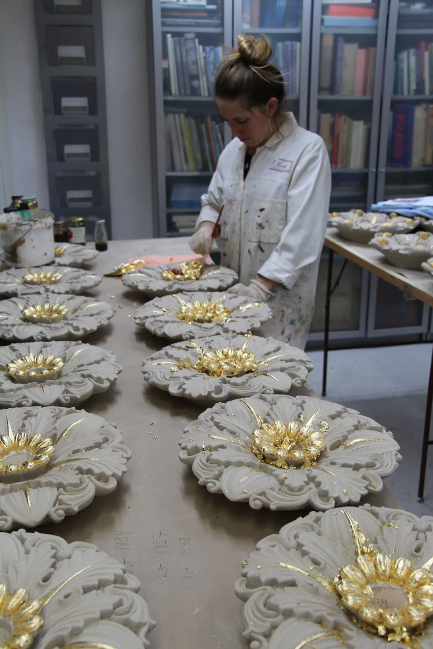71 stycken nytillverkade takrosetter fyllde under några veckor vår lokal på Karlavägen 68. De är gjorde efter fyra stycken originalförlagor från museet . I magasinet Kulturvärden finns en omfattande artikel att läsa om vårt arbete med den lilla men ändå så viktiga pusselbit i denna omfattande renovering.