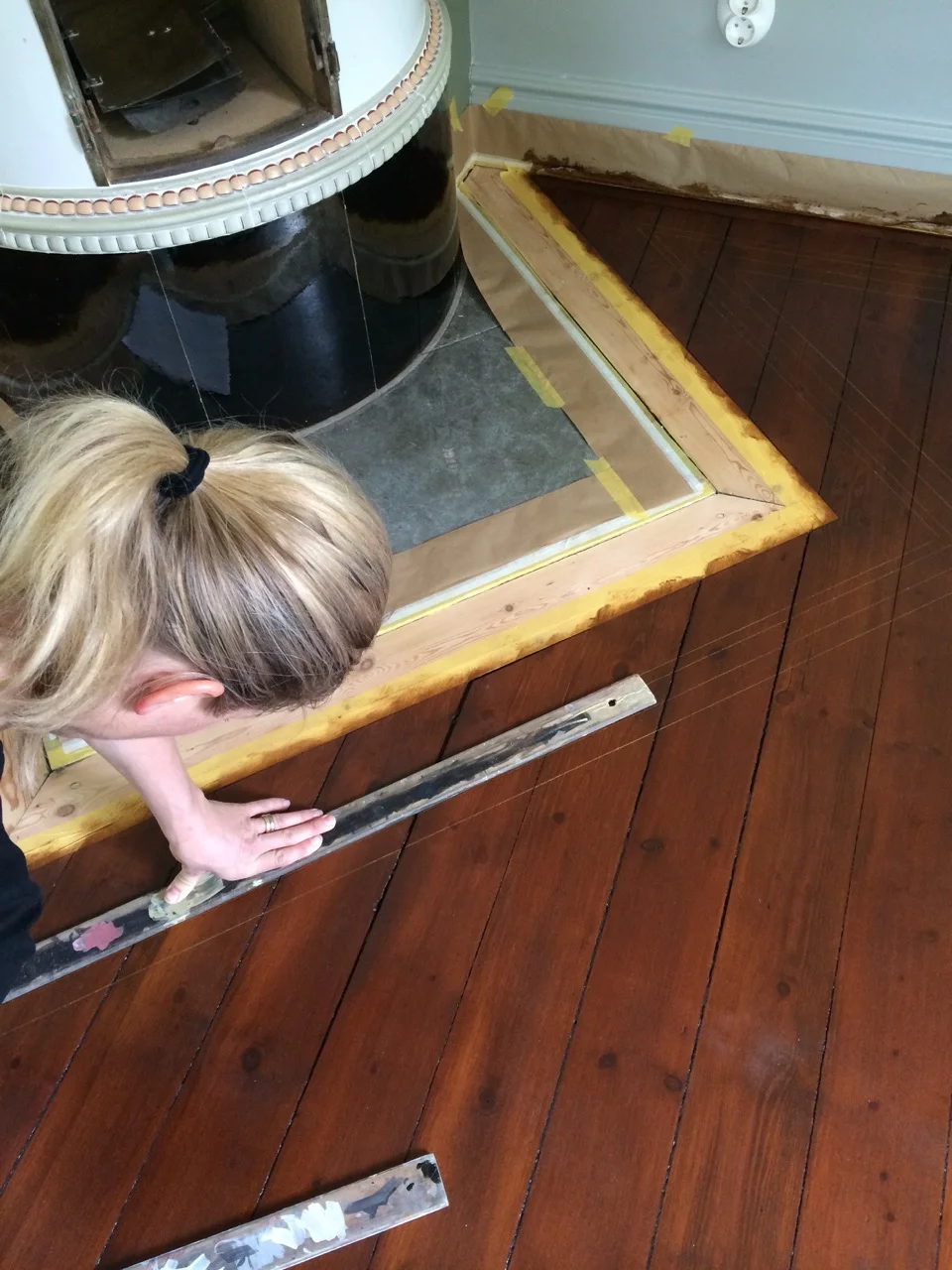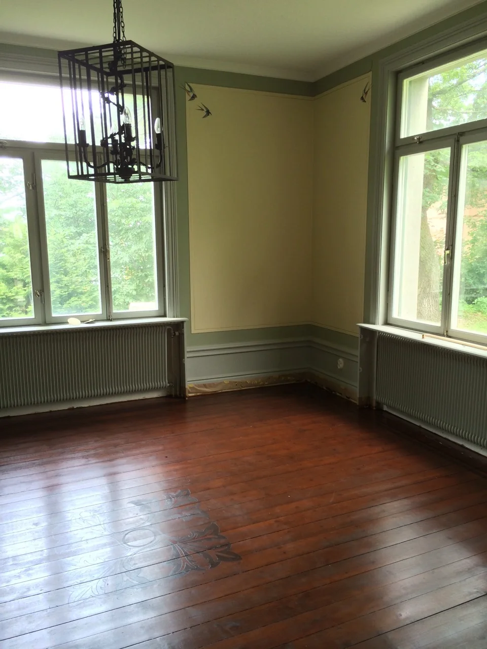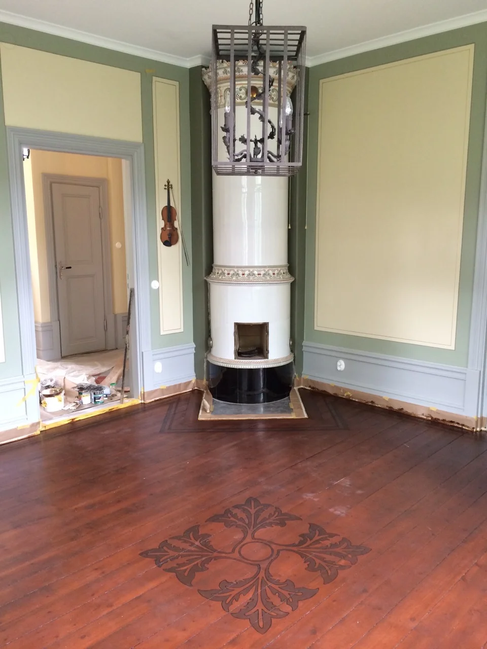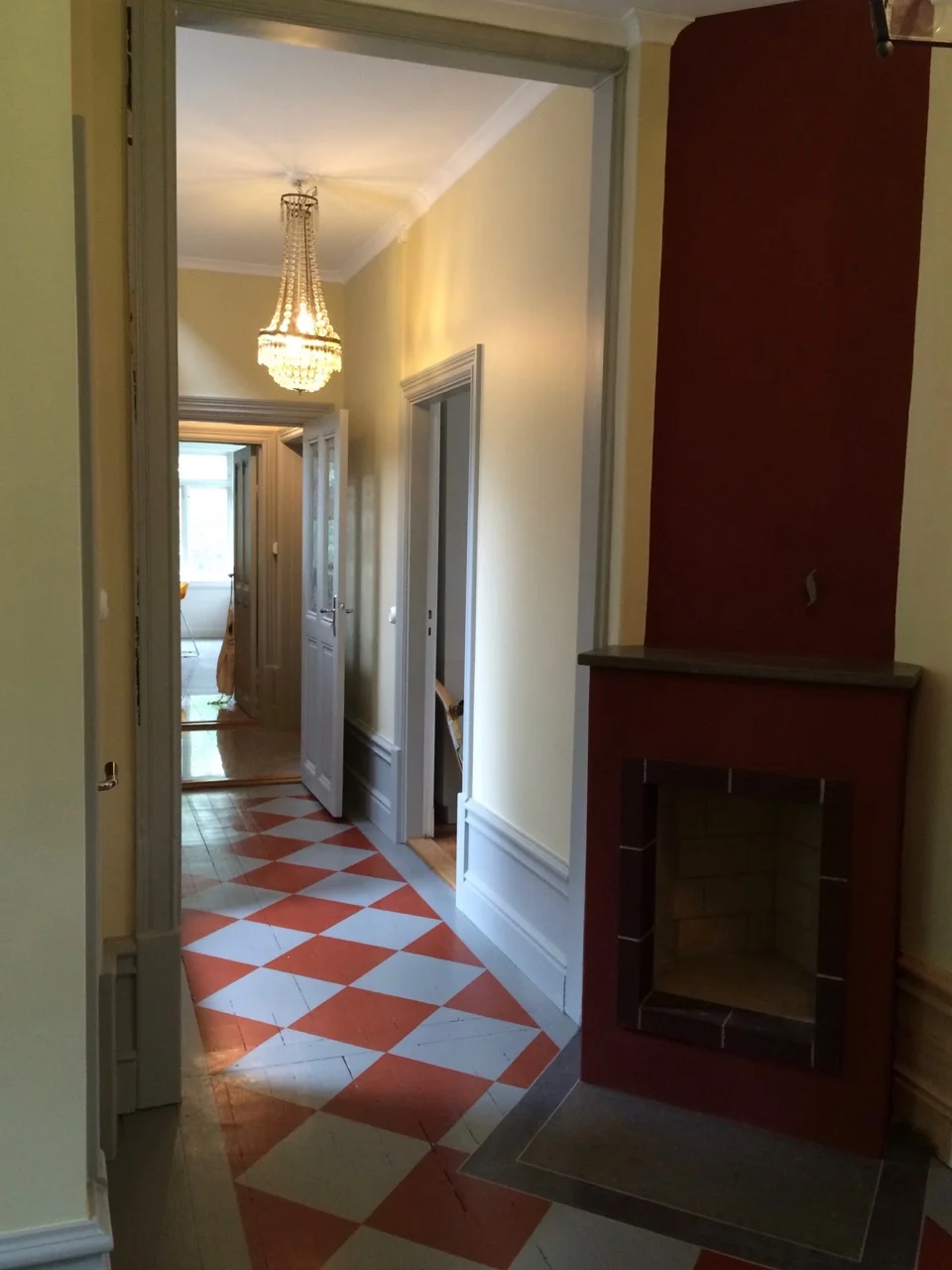 I detta hus har jag färgsatt och målat ett flertal rum. Bland annat är väggarna i matsalen indelade i väggfält, målade svalor flyger omkring i rummet, en fiol har målats direkt på väggen och golvet är infärgat och dekormålat. I hallen är golvet indelat och målat i ett rutmönster